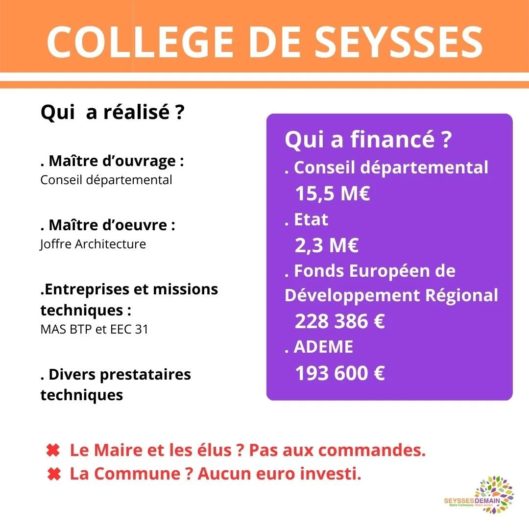 Dans son bilan de mandat (Echo du Binos - page 5), le Maire se fรฉlicite avec des phrases subtiles d'avoir "rรฉalisรฉ" un collรจge moderne et รฉcologique pour les jeunes Seyssois.
